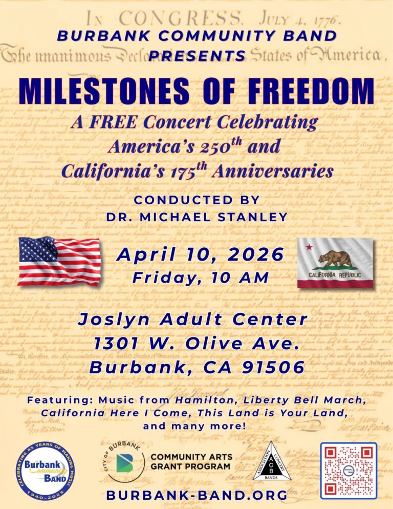 Conducted by Dr. Michael Stanley, this special spring concert commemorates important steps towards freedom in American history, from the 250th anniversary of the signing of the Declaration of Independence through the Civil Rights movement and up to the present day, and also pays homage to the 175th anniversary of California’s statehood. Through music that chronicles the gradual expansion of freedom — from early American melodies to modern works inspired by our national and state journeys — Milestones of Freedom reflects on pivotal moments in American history that defined freedom in many forms. This program celebrates the courage and struggles required to achieve freedom and the enduring belief in a hopeful future, inviting our community to connect through history, heart, and music.