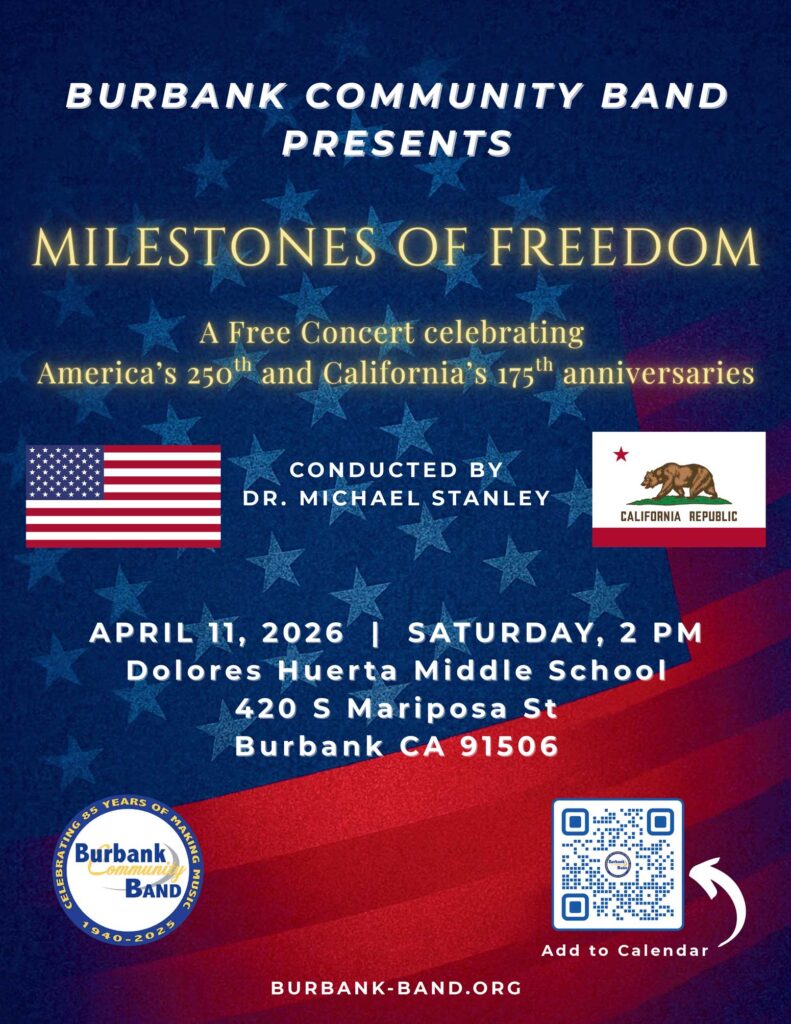 Join the Burbank Community Band for Milestones of Freedom, a free spring concert celebrating America’s 250th anniversary and California’s 175th anniversary. Conducted by Dr. Michael Stanley, this inspiring program brings history to life through powerful band music on Saturday, April 11, 2026.